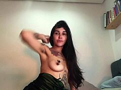 ninfeta safada sticks roller in shaved pussy. naughty latina with big natural tits enjoys double assplay until cum.