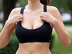 fitness model with hot tight natural tits and athletic body does yoga stretching shoot that becomes handjob scene with fake director backstage