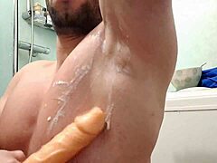 lesbian mature pals with hairy pits bang with strap-on before showering